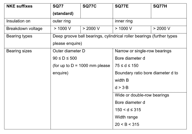 Electrically insulated bearings from NKE, designated with the suffix SQ77, are provided with an oxide ceramic insulation layer. An overview of the various design variants of the insulation layer is given in the table. Electrically insulated rolling bearings from NKE offer exactly the same outer dimensions and technical characteristics as the corresponding uninsulated types.