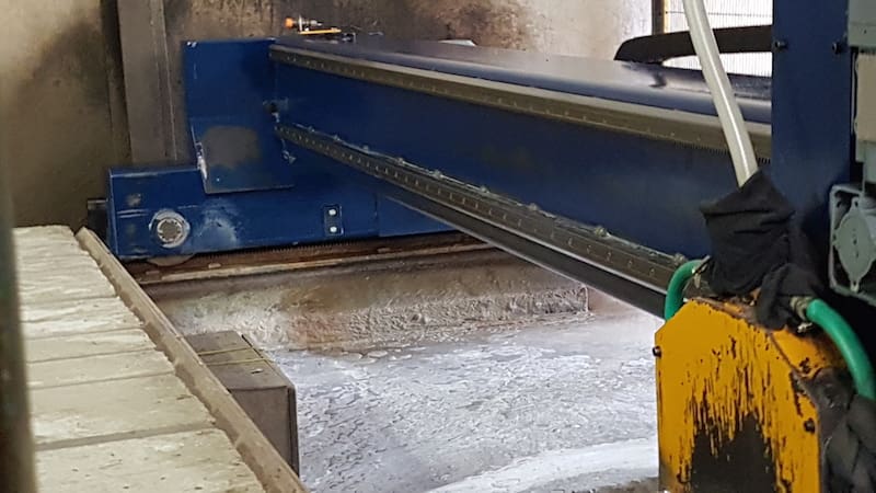 Working 5 days a week for 16 hours a day, an overhead gantry system moves a sawing machine back and forth to cut multiple concrete bars simultaneously in one stroke. 2 x 4 metre HDS2 heavy duty linear guides are attached to a steel framework, and 4 Hepco through hole bearings are fitted to a carriage plate which holds the sawing machine. Pinion driven, HDS2 moves the sawing machine back and forth to cut the bars to size. The lengths vary from 0.5m to 3.5m long. HDS2 is available in one piece up to 4 metres long which neatly accommodates the required stroke length for this application, saving on assembly time.