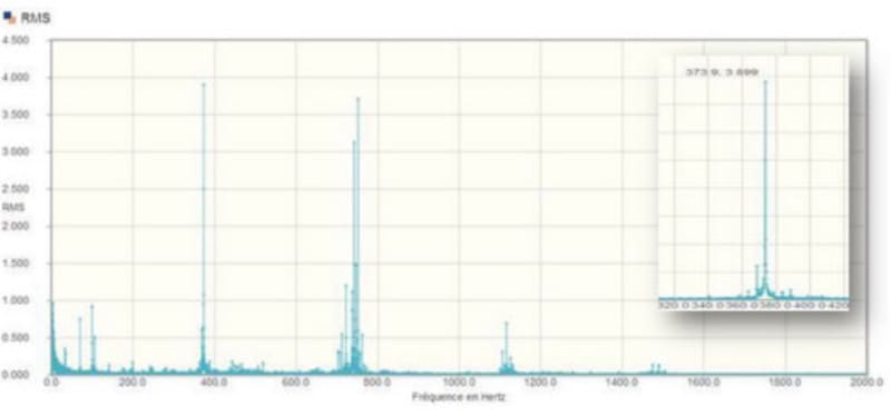 Standard spectrum collected via Wi-care in vertical direction. Display in speed units. The dominant frequency appear at 373,9 Hz and its harmonics.