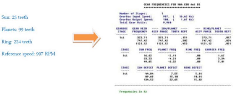 Looking in the drawings and data sheet, we can find the gearbox specifications and calculate theoretical fault frequencies