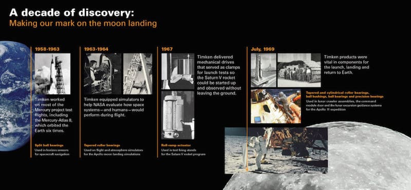 Timken has been involved in space flight since the early years, and later with several companies that also played roles, including the MPB Corporation, Philadelphia Gear, and Torrington. The guidance system that guided Apollo 11’s Lunar Exploration Module to the Moon’s surface worked like a charm, thanks to Timken bearings. NASA used the same system in 1970 to guide Apollo 13 astronauts safely back to Earth after its main guidance systems failed following an oxygen tank explosion.
