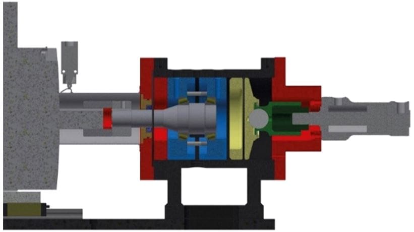 As compared with the standard test setups, customized setups by Elgeti Engineering permit a customized application of loads by which more realistic test conditions can be achieved. Figure 4 shows a multi-axial test rig which allows application of load with three degrees of freedom. This test rig is especially relevant for truck wheel hub bearings, pulley or planet bearings where apart from axial and radial loads, a tilting moment has to be simulated.
