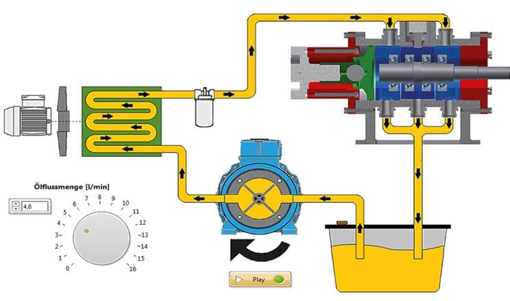 The third method, which is implemented on Elgeti Engineering test rigs, as shown in figure 5, provides complete and precise control of the degree of cooling and the oil flow rate and hence of the oil temperature. A closed loop control scheme is implemented whereby the rotational speed of the heat exchanger cooling fan motor is controlled according to the measured oil temperature (an average of inlet and outlet oil temperature at the housing). If necessary, the rotational speed of the pump motor can also be controlled. An optional heating device can be introduced into the lubrication oil circuit if operation if higher temperature is required.