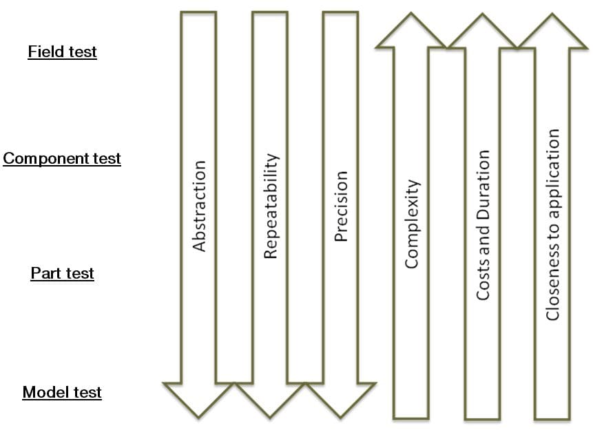 The parameter trends of the various types of test are shown in the figure 7. The field test represents close to zero abstraction since the test takes place in a real application. This test is also highly complex, time consuming and expensive. The part test offers good level of abstraction for a bearing endurance or friction and temperature testing at a reasonable cost and complexity. This test is also precise and has highly repeatable testing conditions.