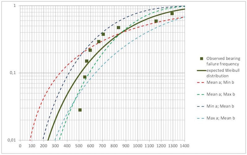 When taken in to account, this variation results in additional plots, shown as dotted lines in the figure 8. It can be concluded that the experimental L10 life of the population, when 10% of the bearings show the first evidence of fatigue failure, lies within certain limits defined by these plots of parameters variation. This interval size can be reduced by increasing the number of test samples. It is obvious that in most cases, gearbox test runs will be far too expensive for providing a sufficient data base.