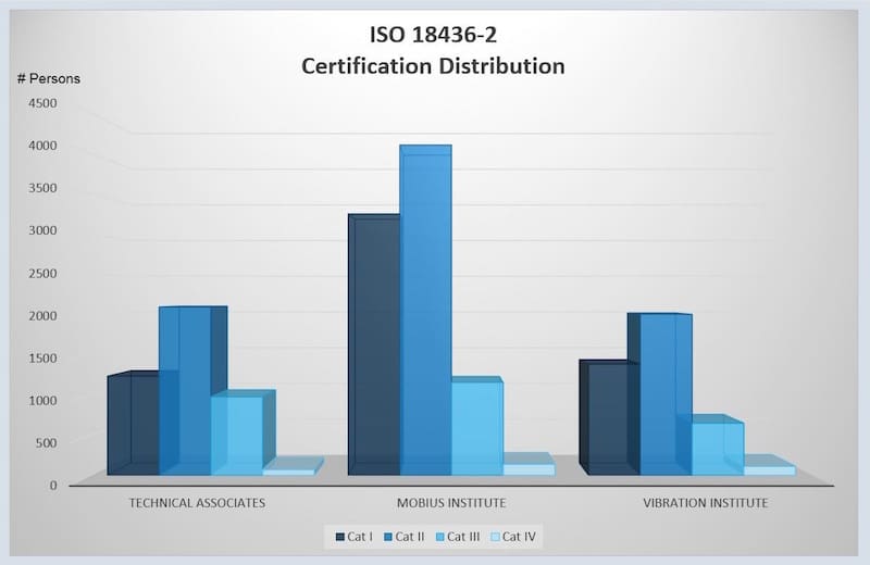 The so called “big three” certification providers are Mobius Institute (MI) by Jason Tranter, Technical Associates of Charlotte (TA) by Jim Berry, and Vibration Institute (VI) by Ron Eshleman. As a newcomer in the certification area, it is very difficult to select between these providers. VI and MI have received accreditation from respectably ANSI and JAZ ANS and to my understanding, TA is not an accredited provider. They are all highly recommended providers and offer Category I+II+III+IV courses that cover the topics listed in ISO 18436-2. The number of valid certificated persons from each provider is illustrated in the following graph, and it illustrates that all providers have a high track record: