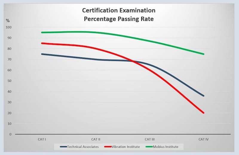 In general, a course has the purpose of increasing the knowledge of a student to a predefined level, and the subsequent test has to measure to what level this has been achieved. When only 20% of the students pass a VI Cat IV examination, something is wrong with the system, not the students. I think to some extend, that Vibration Institute has misunderstood the original intentions of the ISO 18436-2 certifications. It is not a University degree, but an applied approach to condition monitoring. If you want to do deep dives into signal processing, rotor dynamics there are much better offers at our Universities. Overall, I would have expected a passing percentage close to the MI course for all providers.