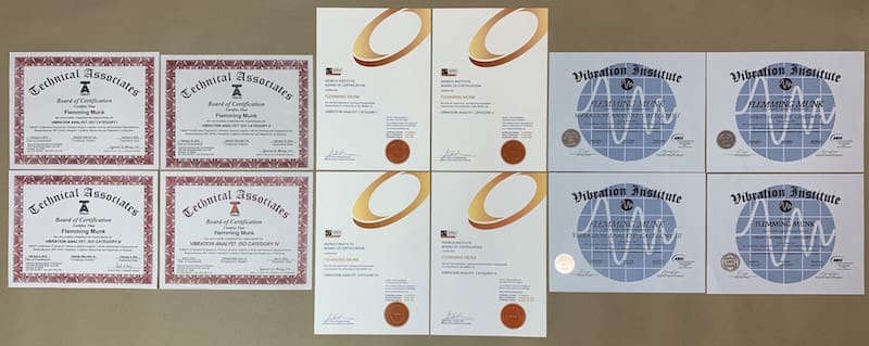Today – the mission is completed – I have read 7300 pages of condition monitoring theory for the courses, calculated 1300 exercises and passed 12 certification tests (42 hours examination and 960 certification questions). To the best of my knowledge, I am the first one to have a full certification track from all three providers – 12 certifications in total: