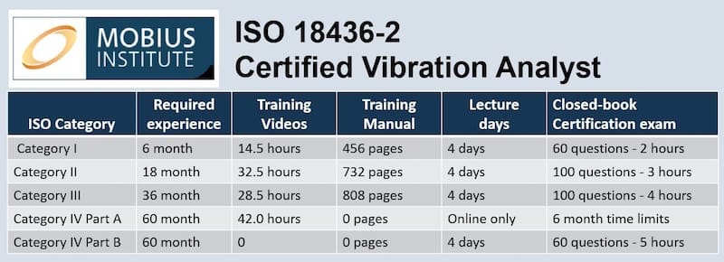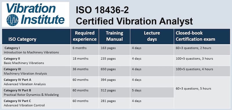 - MI has divided Cat IV into a part A (online video section) and a part B (classroom lecture). Part A must be completed before Part B. Part A – the online part is 42 hours of video, with approximately 22 hours review of the Cat I-III material and optional topics, and 20 hours for covering Principles of Vibration, Rotor Dynamics, Fault Diagnosis and Balancing. The classroom lectures will be a review of the online video section. No training manual is provided for Cat-IV, but a copy of the overheads from the online video section will be provided at the classroom lecture.