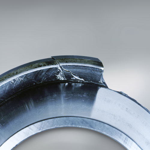 Fracture refers to small pieces which were broken off due to excessive load or shock load acting locally on a roller corner or rib of a raceway ring.
