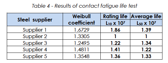 The evaluation was performed in a Test Life Prediction tester with a maximum contact stress of 4508 MPa and 2040 rpm. Each of the five testing groups contained a number of 16 test specimens. For each group, the tests were conducted up to the fatigue failure of all the specimens of the group.