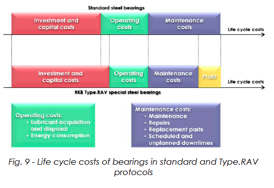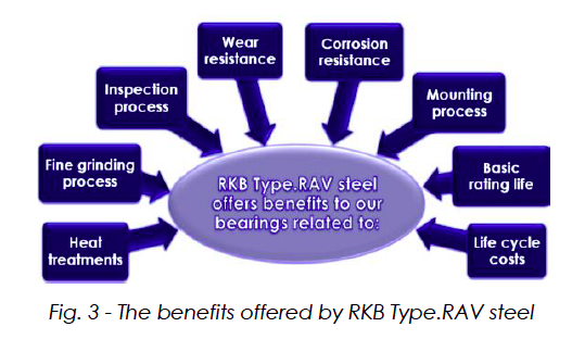 As shown in figure 3, the benefits offered by the RKB Type.RAV steel to our bearings are evident in terms of heat treatments, fine grinding and inspection processes, wear and corrosion resistance, easy mounting process, basic rating life and life cycle costs (figure 3).
