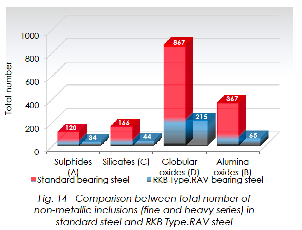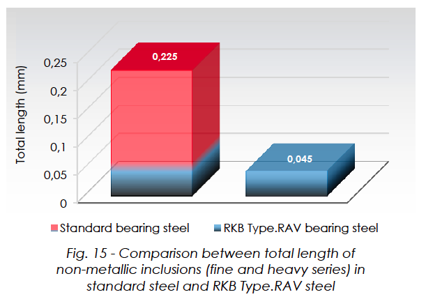 Figure 14 shows that the number of sulphides, silicates, globular oxides and alumina oxides, in fine and heavy series, is much higher in standard bearing steel than in RKB special bearing steel. The evaluation of the total length of non-metallic inclusions consisted in a longitudinal (parallel with the material flow lines) section inspection. As figure 15 points out the total length turns out to be much higher in standard steel than in RKB Type.RAV steel.