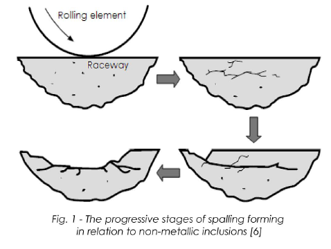 If two groups of identical rolling bearings were manufactured using the same type of materials, but from different lots, which means possible different contents of non-metallic inclusions, a considerable difference in the distribution of the actual fatigue lives might be expected [5]. The existing non-metallic inclusions act as stress risers able to initiate micro-cracks during the repeated contact stresses introduced by the rolling load in the shallow layer of the raceways. Eventually these micro-cracks can break through the raceway surface and in time spalling may occur and lead to total bearing failure (figure 1) [6].