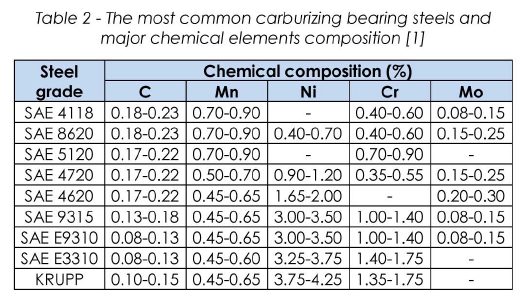 – the case-hardened steels (table 2),for which a carburizing treatment increases the carbon content up to 0.65-1.10 % only in a superficial layer of 0.7-3.5 mm thickness, where a proper hardening and tempering treatment ensures the needed high hardness of 58-64 HRC,while maintains the rest of the material at a much lower hardness 0f 32-48 HRC that provides a better operating toughness.