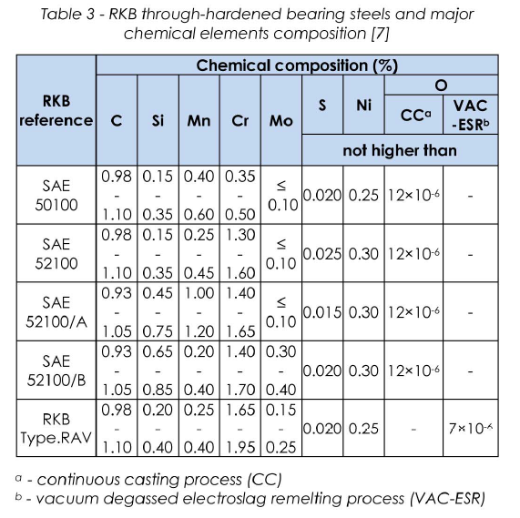 In the regard, to ensure the required hardness, high resistance to contact deformation and wear, and good dimensional stability, RKB bearings are primarily made of SAE 52100 through-hardened high carbon chromium steel as presented in table 1. In order to guarantee the premium quality of its products, the RKB Group regularly and carefully checks the steel chemical composition, especially the upper limits of oxygen content (table 3).