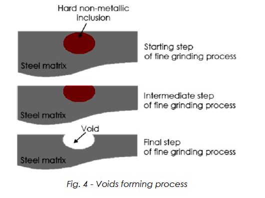 The higher content of non-metallic inclusions of SAE 52100 standard steel manifests firstly as a disadvantage during the fine grinding process, when the softer steel matrix surrounding the hard brittle non-metallic inclusions is partly removed. The removal of the inclusions from the steel surface forms voids or pits (figure 4). Furthermore, during bearing running, these voids can react as micro- crack initiators that finally may lead to the total bearing failure. On the contrary, the RKB Type.RAV steel, thanks to its high cleanliness rate remarkably, decreases the probability to produce such cavities.