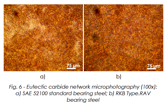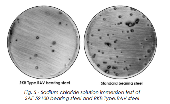 The high corrosion resistance of the RKB Type.RAV steel was proved in a sodium chloride solution immersion test (figure 5). As it can be easily noticed, there is excessive rust on the SAE 52100 standard bearing steel surface compared with the RKB Type.RAV steel sample. In fact, standard bearing steel contains coarse eutectic carbides that act as crack initiators and reduce chromium content in the martensitic matrix (figure 6a).