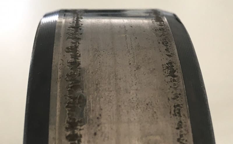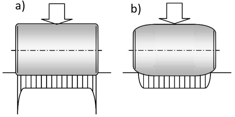In roller bearings, there is line contact between the rolling elements and the raceway. If the rolling elements are perfectly cylindrical (cylindrical roller bearings) or tapered (tapered roller bearings), this leads to local pressure peaks when the end side of the rolling elements comes into contact with the raceway (Figure 1a). This can result in local pitting damage in these areas (Figure 2). To avoid these pressure peaks, roller bearings are always designed with profiling along the longitudinal axis of the roller (Figure 1b). In addition to avoidance of high edge stresses, the profiling also has an influence on the following criteria: