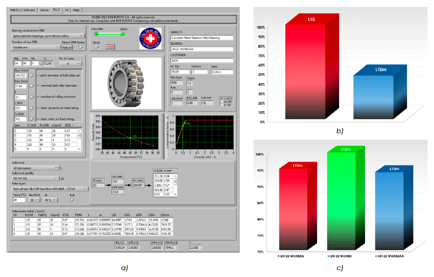 To calculate the bearing life under the above mentioned percentages and considering the applied loads, variable speed, operating temperature, lubricant influence and the requirements regarding service life, reliability and safety index, RKB RRLC in-house developed patented software system was used. The modified rating life L10m (Fig. 6 c) calculated with RRLC software (Fig. 6 a), for all of the three bearings, taking into account the application specifications, satisfies the required design life of the complete gearbox-drum system. As shown in Fig. 6 b, the difference between the basic rating life L10 and the modified rating life L10m of the 24122 WOR82AA design is considerable. The modified rating life decreases because the bearing is subjected to low operating speeds, using the same lubricant quality as for the gear of the input shaft that runs at high rotational speed. In this case, extreme pressure additives will be used to provide boundary or mixed lubrication and anti-scuffing protection. Also, according to the gearbox manufacturer, the first change of the lubricant is to be performed at 100 operating hours so as to remove any metal particles that can damage the bearings. The following lubricant change must be made after every 1000 operating hours or within one year.