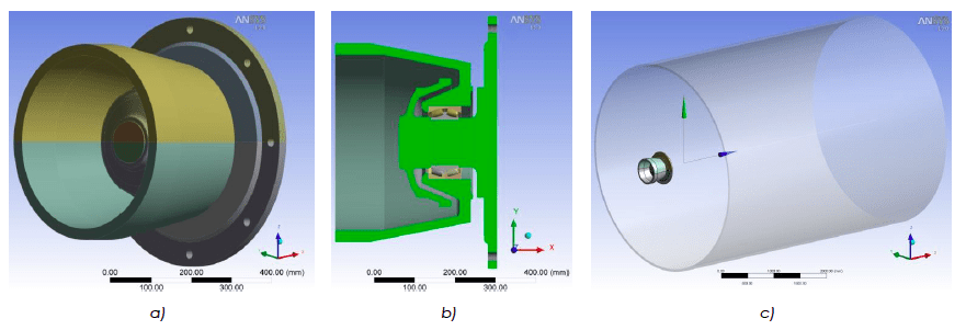 The hinged support is represented by the main spherical rolling bearing inside the concrete mixer gearbox housing. This support has been modeled to constrain the displacements of the drum along the axial and radial directions (X, Y and Z axis). The reaction forces of the hinged support are generated by the concrete mixer gearbox main housing, which in turn has been constrained with a fixed support.