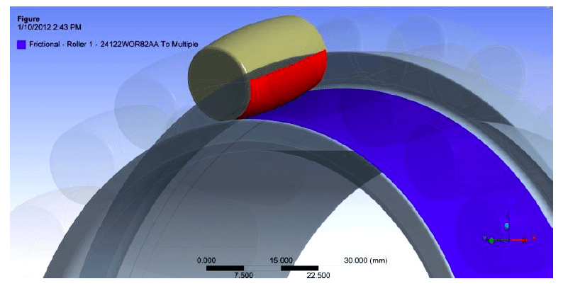 RKB engineers subjected the three different bearing designs to FEM and SAM analysis to achieve maximum performance and reliability. With a numerical approach, all the analyzed bearing designs (24122 WOR82A, 24122 WOR82, and 24122 WOR82AA) have been evaluated in terms of reaction forces, von Mises equivalent stresses, and contact pressure distributions. For this purpose, several static structural analyses have been performed by using Ansys 13, the leading finite element software tool. In particular, the following steps have been taken: