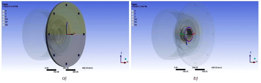 After implementing the contact definitions for the rolling bearing components, other connections have been established for the rest of the model components. To simulate the actions of the bolts, which connect the mixing drum and output flange, the beam structure with tubular cross-section representing the drum has been connected with the flange by using a rigid joint. As Fig. 9 shows, a coordinate system has been created in the center of the flange to relate all the degrees of freedom (three translations and three rotations) of the beam edge with the holes of the drum. To let both cages move according to the inner ring, the same type of rigid joint has been applied, but having as a reference a coordinate system located in the bearing center of rotation (Fig. 9 b).