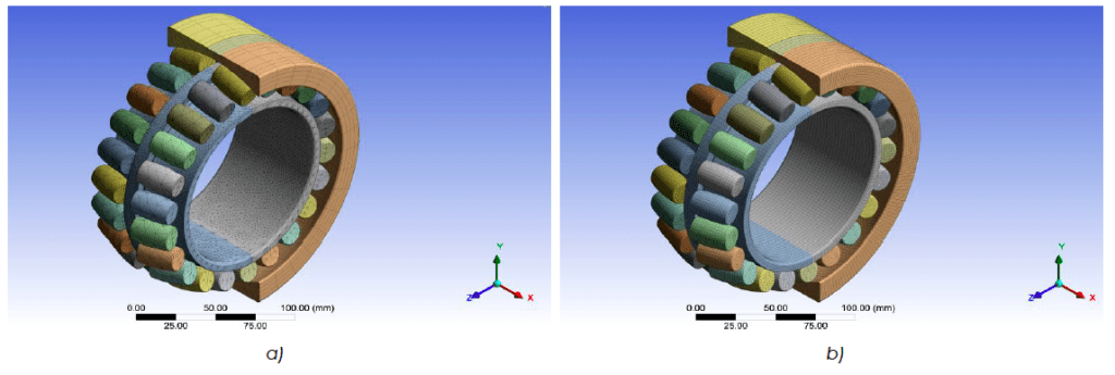 Initially, the discretization of the geometrical model in finite elements has been performed automatically with the default settings of the Ansys Mechanical module. As is evident in Fig. 10 a, the finite elements are not regular and are distorted in the case of rollers. Moreover, all of the bearing components present a low density mesh that may affect the accuracy of the solution, especially in the contact regions where the contact area between rollers and inner and outer ring raceways is a point. Thus, further mesh operations (Fig. 10 b) have been performed in order to obtain a uniform element distribution with a high density population only in the bearing interest areas. For the rest of the components, meaning the main shaft with the output flange, a part of the main housing, the convex gear and the drum, a coarse mesh has been used to reduce the total number of elements, speeding up the analysis solving time.
