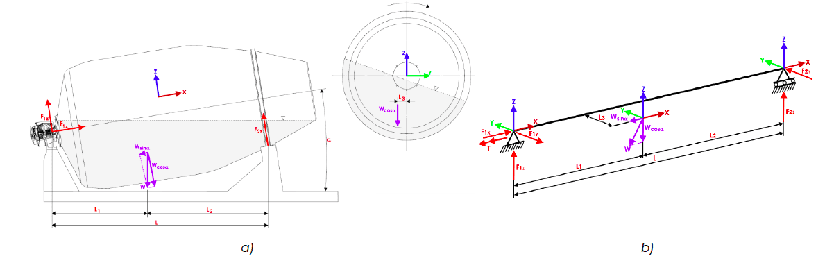 In Fig. 11 a, the application point of the total load is out of the drum median plane and for a better understanding two views in different planes are given (Z-X and Z-Y planes). Due to the fact that the drum axis of rotation is inclined with angle, with respect to horizontal axis, the total load affects the structure also with an axial component, taken entirely by the hinged support. The total load (W) has been projected, on the Z-X plane, along Z and X directions taking into account the inclination angle of the drum. The resulting components produce reactions called F1x, F1z on the hinged support and F2z on the roller support.