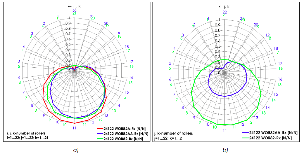 Moreover, the change of inner ring contact angle brings more benefits in terms of reaction forces (Rx) generated in the contact between the side faces of rollers on the most loaded row and the lateral face of the central fixed rib (Fig. 13 b). Since 24122 WOR82A design has a non-integral rib design, reaction forces Rx are not present but are included in reaction forces Rz.