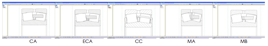 In general, distinct heavy engineering applications incorporating spherical roller bearings may need different bearing configurations, such as the CA, ECA, CC, MA and MB, showed in Fig. 1, just to mention the most common. The differences primarily lie in the design of the inner ring and cage. Because of the technical characteristics of the present application, such as low rotational speed, high thrust load, moderate shocks and increased misalignment, the bearing design must feature a cage made of two pieces that enable the two rows of reinforced rollers to move independently from each other.
