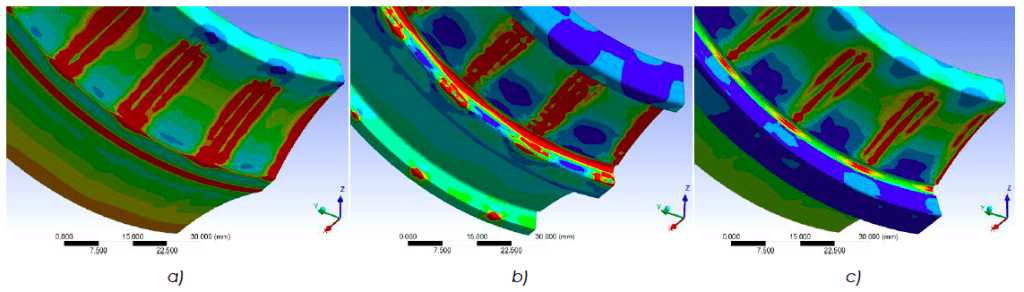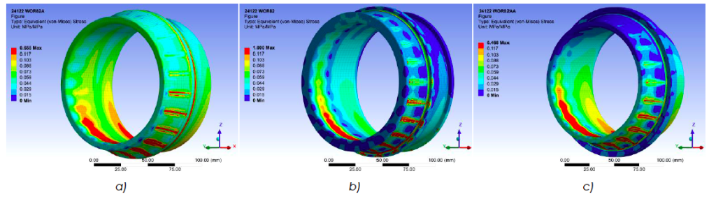 Moreover analyzing in detail the inner ring stress distributions from Fig. 17 a, the presence of edge stress concentrations on the proximity of the inner raceway edge of 24122 WOR82A design can be observed. A possible explanation of this effect is connected to the rotation of the rollers around an axis perpendicular to the main axis of the bearing, induced by the high misalignment of the mixing drum and the heavy axial load, that tend to modify the contact area between rollers and raceways. This effect is reduced in the other two designs (Fig. 17 b, c) by the central fixed rib, which guides the rollers during bearing operation. Still, high forces act on the central fixed rib of 24122 WOR82 design (Fig. 17 b), which induces, as mentioned before, undesirable stresses inside the rib. As for 24122 WOR82AA design, very low edge stresses on the inner ring raceway and a proper guidance of the rollers are ensured without causing undesired stresses inside the central fixed rib.