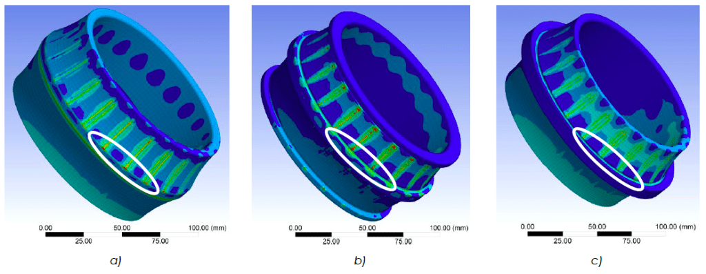 The same concept followed in case of bearing assemblies has been used also to evaluate von Mises normalized equivalent stress distributions inside the inner rings (Fig. 15). Analyzing the von Mises stress graphics related to the inner ring, it can be observed that the central fixed rib is subjected to load. 24122 WOR82AA design presents a reduced stress magnitude than 24122 WOR82. These results are confirmed by the graphic from Fig. 13 b, where the reaction forces Rx of the 24122 WOR82AA are significantly lower than those of 24122 WOR82.