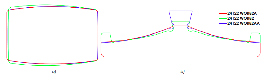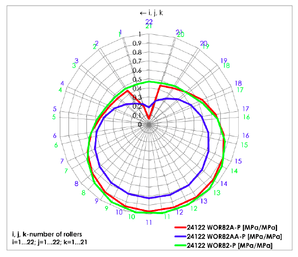 The pressure distributions of the three bearing designs, obtained with NON-HERTZ software, are depicted in Fig. 18. For this representation, all the contact pressure values have been normalized by using the maximum value of the most loaded roller of 24122 WOR82 with all designs. As can be seen, there is a slight difference between 24122 WOR82 and 24122 WOR82A designs in terms of contact pressures distribution, but a major difference in the upper part of the pressure distribution graphic of 24122 WOR82 design. This seems due to the different contact angle, number of rollers, both smaller in case of 24122 WOR82 design, and implicitly to the normal reaction forces (Rz) depicted in Fig. 13 a. On the contrary, the 24122 WOR82AA design presents a lower contact pressure distribution of all rollers compared to the other two designs. These are the results of the improved internal geometry design in terms of contact angle and central fixed rib reinforcement.