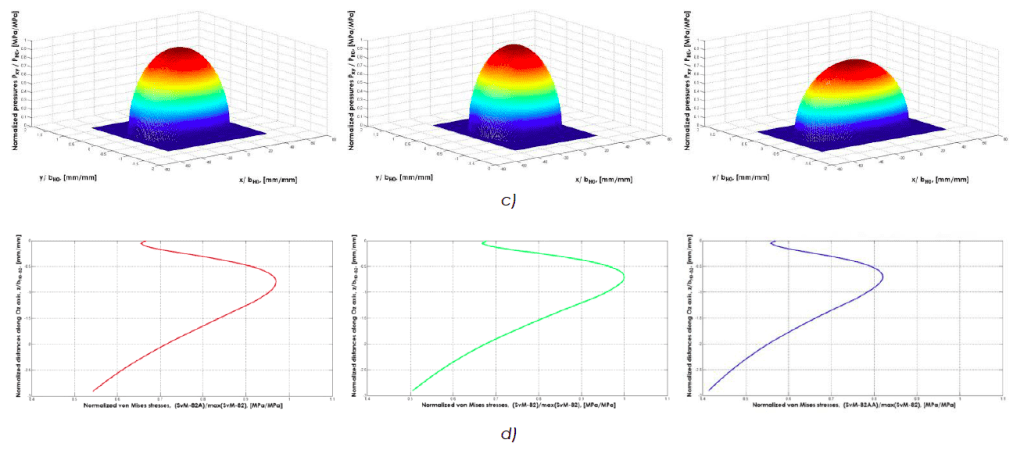 Having the pressure distribution values on the contact area of the most loaded row of rollers, the NON-HERTZ software has been further involved in obtaining the depth distributions, inside the shallow layer, of all six components of the stress tensor and finally the depth distribution of von Mises equivalent stresses of all three inner ring designs (Fig. 20 d). The components of the stress tensor, induced by the entire pressure over the contact area, in a generic point M(x, y, z) are obtained by superposition and using the convolution products: