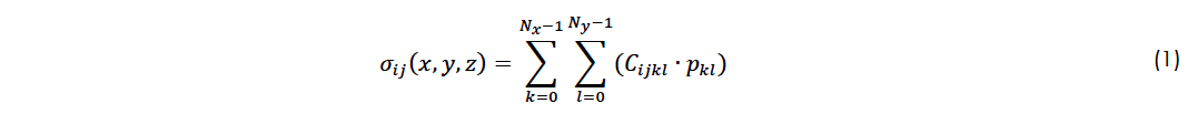 where the influence function Cijkl(x, y, z) describes the stress component ij(x, y, z) due to a unit pressure acting in patch (k, l). This is a Neumann type problem of the elastic half-space theory. Based on stress tensor components the von Mises equivalent stress can be obtained using its definition: