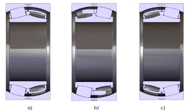 RKB 24122 WOR82AA design (Fig. 3 c) is a bearing with symmetrical rollers, a two-piece pressed steel window-type cage for each row of rollers guided on the inner ring central fixed reinforced rib. This design encompasses the previous 24122 WOR82 design featuring an increased numbers of rollers and length for a greater load rating. The central fixed inner ring rib is reinforced to sustain additional load and friction.