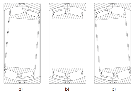 Due to their design and macro-geometry, all of the three bearing designs are able to withstand the application particularities, but care has to be taken on the magnitude of axial loads applied combined with big shocks and variable misalignment. Under extreme operating conditions the misalignment value between the inner ring and outer ring is variable and consequently additional sliding motions will be generated in rollers-raceways contacts as well as rollers-cage contacts. These supplementary motions occur in a poor lubrication regime that leads to increased friction and temperature, causing abrasive and adhesive wear and finally determining bearing failure. Therefore, it is highly recommended that the misalignment of the inner ring with respect to outer ring not exceed the designed, permissible angular misalignment value (Fig. 6). According to the application operating conditions, the right choice of lubricant type and quality is fundamental (suitable viscosity and cleanliness) to achieve the necessary elastohydrodynamic film thickness.