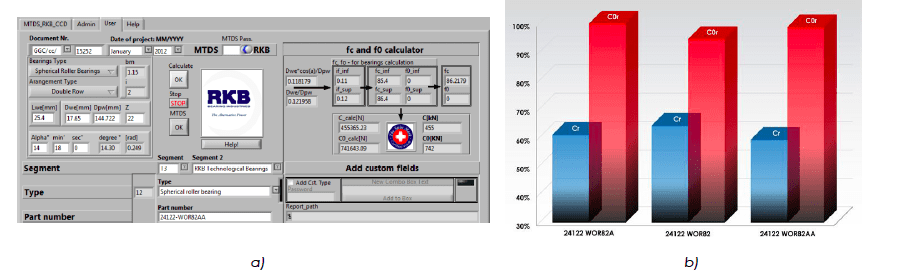 The RKB MTDS software (Fig. 5 a) offers consistent background information on the calculation of the bearing static and dynamic load ratings according to the latest versions of ISO 76 and ISO 281. The differences in static and dynamic load ratings, due to the internal macro-geometry particularities of the three bearings, are normalized and shown in Fig. 5 b.