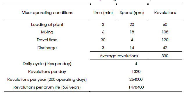 The drum weight and part of the weight generated by the concrete volume act directly on the drive main bearing as a combined radial and axial force. The variable operating conditions imposed by the drum mixing cycles have a direct influence on the main bearing life. In order to evaluate the bearing life it is necessary to reduce the described working conditions to a limited number of cases (Table 1). In this case, each different load level from the variable loads is accumulated and reduced to a constant load. These duty intervals are averaged in given percentages of time fractions, speed intervals, temperature differences, lubrication conditions and levels of contamination.
