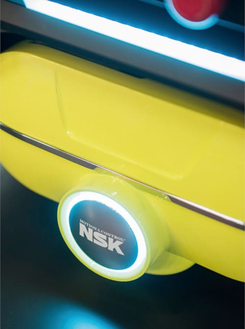 The quiet nature of NSK’s wheel unit can be attributed to its gearless structure (direct-drive motor), which leverages the technology behind the company’s Megatorque Motor to eliminate the operating noise generated by typical gearboxes. Using the Megatorque Motor as a wheel was a new concept, and NSK had to invent ways of employing the system’s parts to create the optimal specification at a reasonable cost.