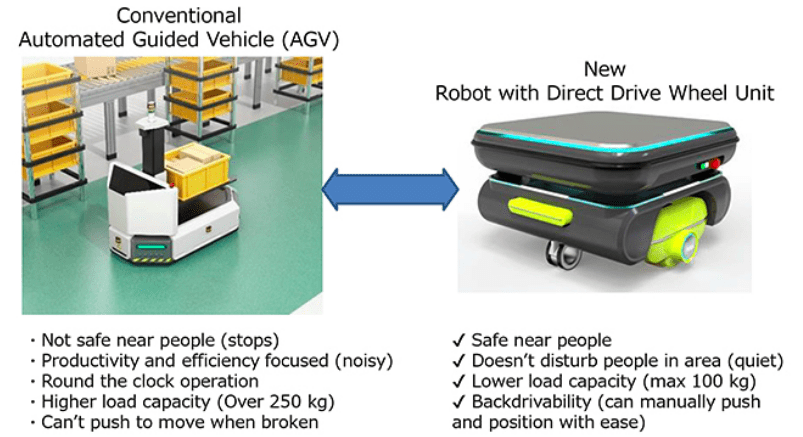 Accordingly, NSK moved to develop a direct drive motor wheel unit, which can operate much more quietly than conventional drive units thanks to its gearless structure. The direct drive wheel unit is designed to be safe around people and is ideal for use in service robots, power-assist push carts, and other collaborative robot applications.