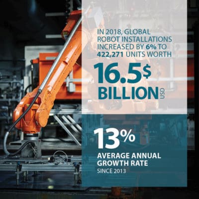 According to the International Federation of Robotics, industrial robot sales doubled globally from 2013 to 2017, and reached a record USD $16.5 billion in sales in 2018. While automotive and electronics manufacturers remain the largest adopters with about 45% of the market between them, the industry is diversifying. Food and beverage has doubled its robot installations since 2013, for example, seeing a 73% increase in the U.S. in 2018.