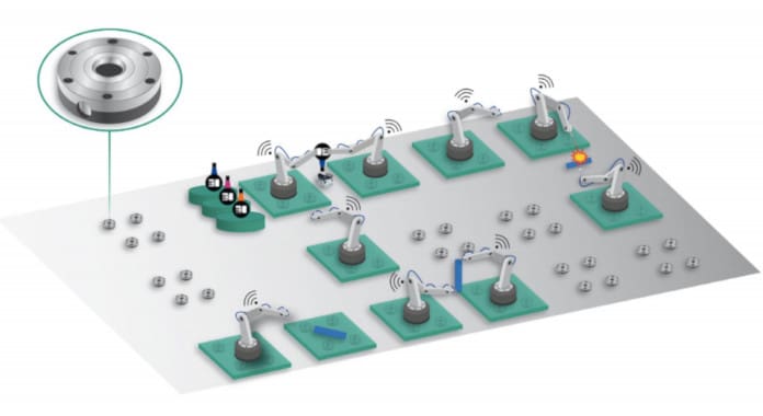 This innovative production system focuses on mapping entire production flows using uniform standard kinematic systems based on vertical articulated-arm robots. In addition to the usual robotics handling tasks, the standard unit also carries out diverse other processes, such as assembly, 3D printing, cutting and joining, and machining. Standard kinematic production set-ups allow frequent and flexible rearrangements of the production system without the need to purchase additional equipment. The simple and quick change of a production layout is supported by a grid of zero-point clamping systems. This grid extends over the entire production area and allows the standard kinematic systems to be quickly repositioned at the specified clamping points.