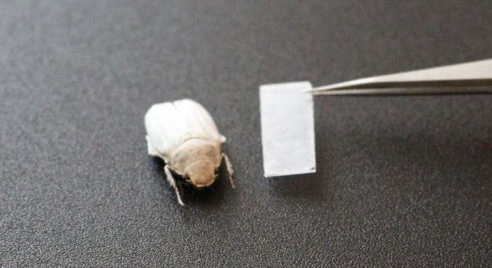 A nanostructured polymer film modeled on the white beetle Cyphochilus insulanus produces a brilliant white coating. (Photo: Julia Syurik, KIT)