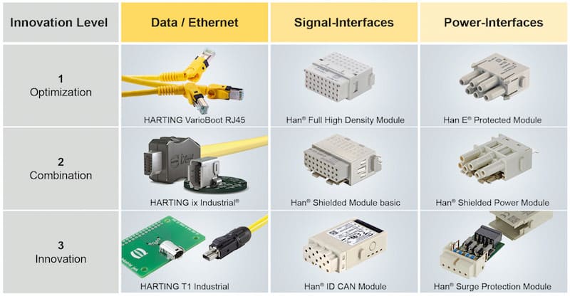 The HARTING Technology Group supports miniaturisation in mechanical and plant engineering by providing solutions for all interfaces essential in modern control, drive, HMI and communication technology for manufacturing systems. The decisive factor is that miniaturisation does not entail any functional restrictions. The same three levels of innovation can be traced in the products and solutions for industrial interfaces, which, depending on the level of miniaturisation and the integration degree, are expedient for the respective application.
