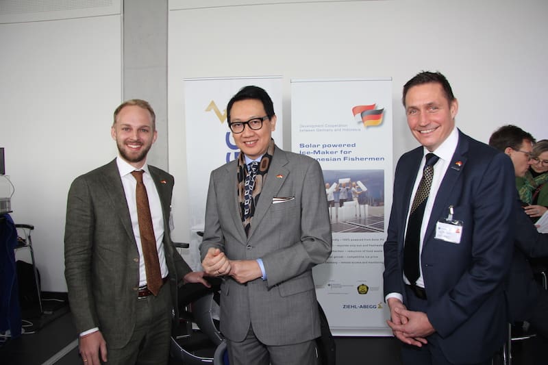GIZ representative Frank Stegmueller (left) and Steffen Sinn (Ziehl-Abegg, right) present the Ambassador of Indonesia in Germany, Arief Havas Oegroseno, the Solar Ice Maker.