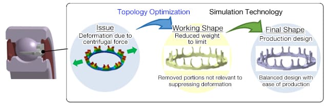 - Topology optimization contributed to reducing weight to the utmost limit by removing parts that do not contribute to the strength and rigidity of the cage, and to deriving the optimal cage shape for high-speed rotation. The cage was developed with a very short turn around by utilizing leading edge simulation technology to verify performance and production considerations.