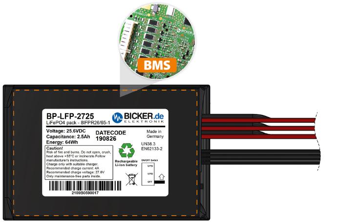 The LiFePO4 battery pack BP-LFP-2725 impresses in safety-relevant applications with a particularly stable battery chemistry, a long service life of at least 10 years and more than 6000 full charge and discharge cycles. For all high-performance battery packs, Bicker Elektronik consciously relies on the particularly safe lithium iron phosphate chemistry, which makes thermal runaway almost impossible. Only brand high-performance cells from LithiumWerks are used for the BP-LFP-2725, which clearly stand out from other manufacturers on the market due to their long service life and high cycle stability. The automated production of the high-performance cells ensures consistently high quality. Combined with the specially developed battery management system (BMS), Bicker Elektronik can guarantee the highest level of product safety and reliability.