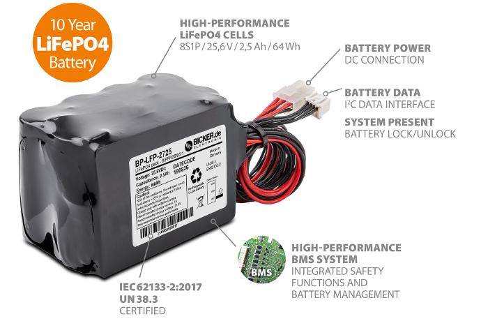 With the new BP-LFP-2725, Bicker Elektronik, Donauwoerth/Germany, presents an intrinsically safe 10-Year battery pack for emergency power supply and DC UPS systems. The lithium iron phosphate energy storage device with an integrated battery management system (BMS) is designed for applications that place the highest demands on quality, safety and reliability. The compact BP-LFP-2725 with high energy density is designed for more than 6000 full cycles and is therefore ideally suited for use in particularly demanding applications in the industrial environment and medical technology. The battery pack is tested and certified according to IEC62133-2 and UN38.3.